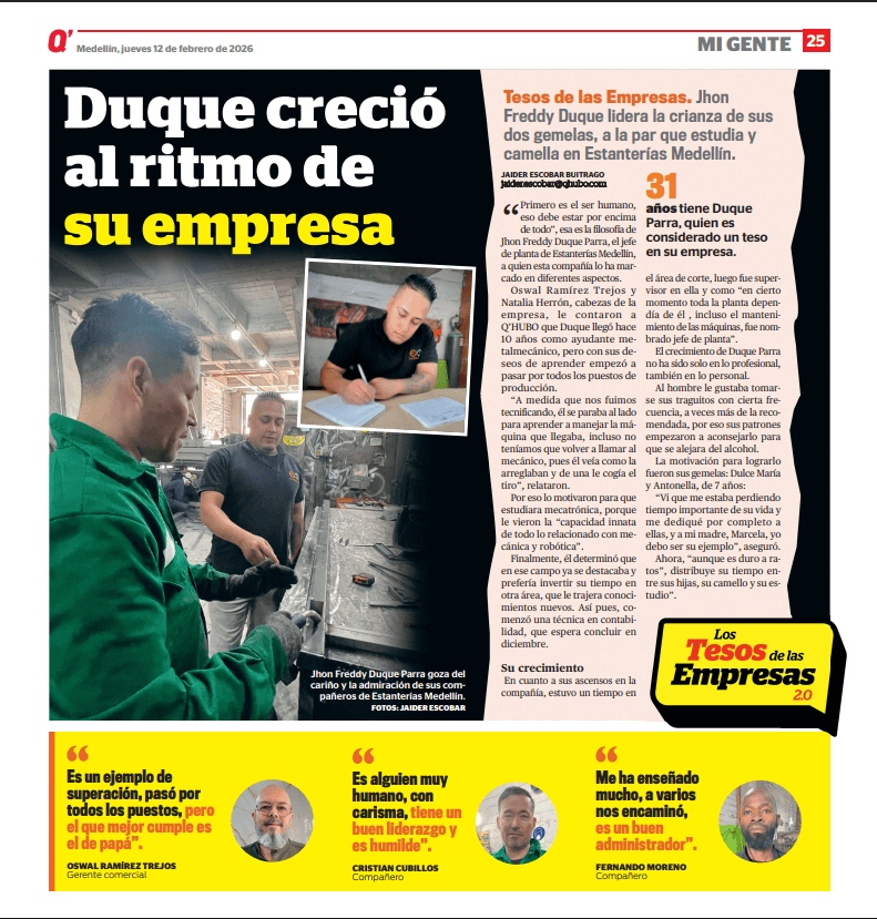 Llegó como auxiliar metalmecánico hace 10 años y hoy lidera toda nuestra producción. El periódico Q’hubo destaca la historia de superación de Freddy, un padre de gemelas que transformó su vida y es hoy un referente técnico y humano en Estanterías Medellín.